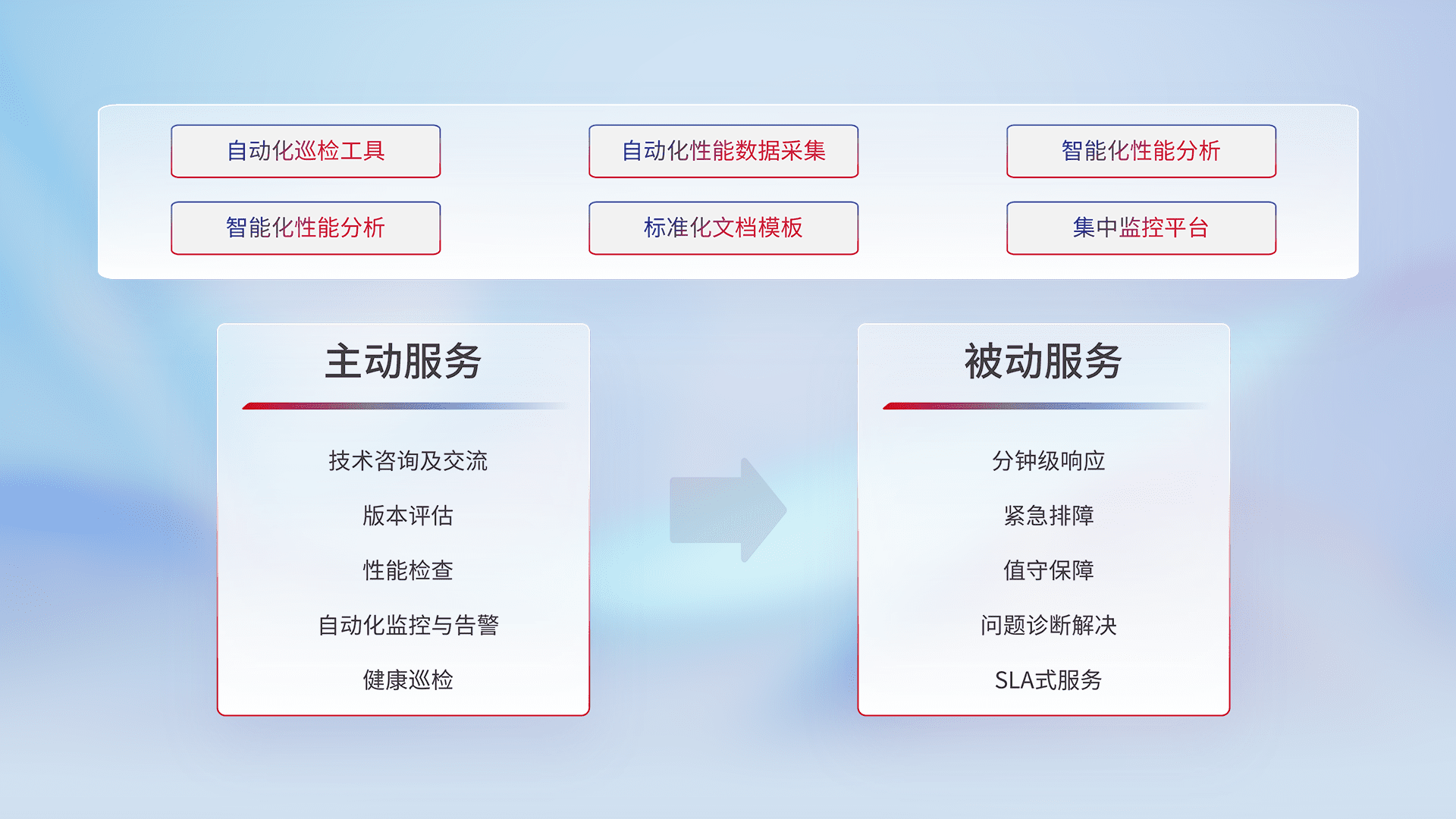 智能化工具和标准化文档,,,,保障服务质量,,,提供主动服务(包含技术咨询、、版本评估、、性能检查、、自动化监控与告警、、健康巡检)和被动服务包含(分钟级响应、、紧急排障、、、值守保障、、、、问题诊断解决、、SLA服务)。。。