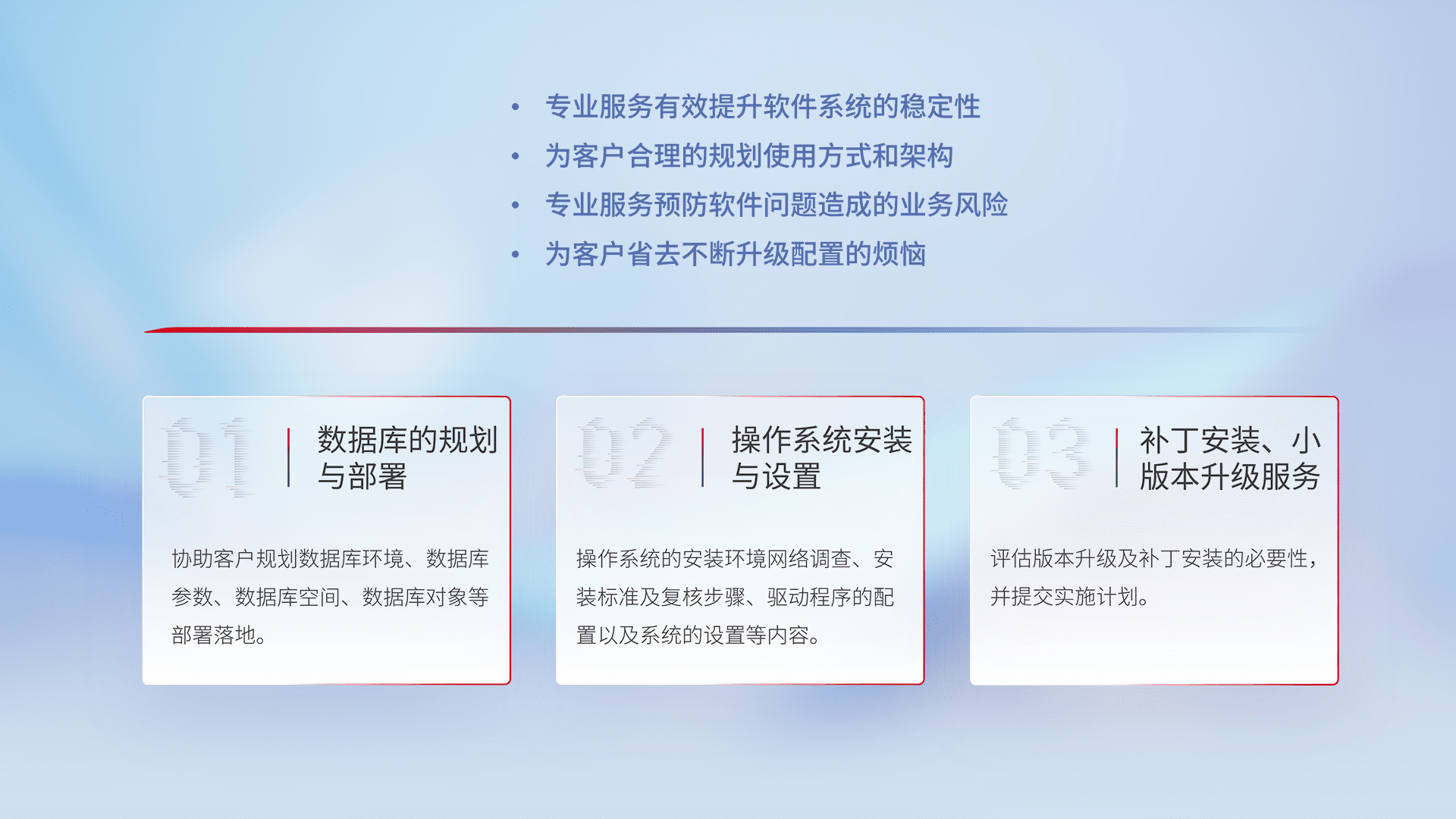 为客户提供软件规模升级、、、快速部署、、、按需配置的专业服务,,,从数据库的规划与部署到操作系统的安装与设置,,,,再到补丁安装和小版本升级提供支持。。